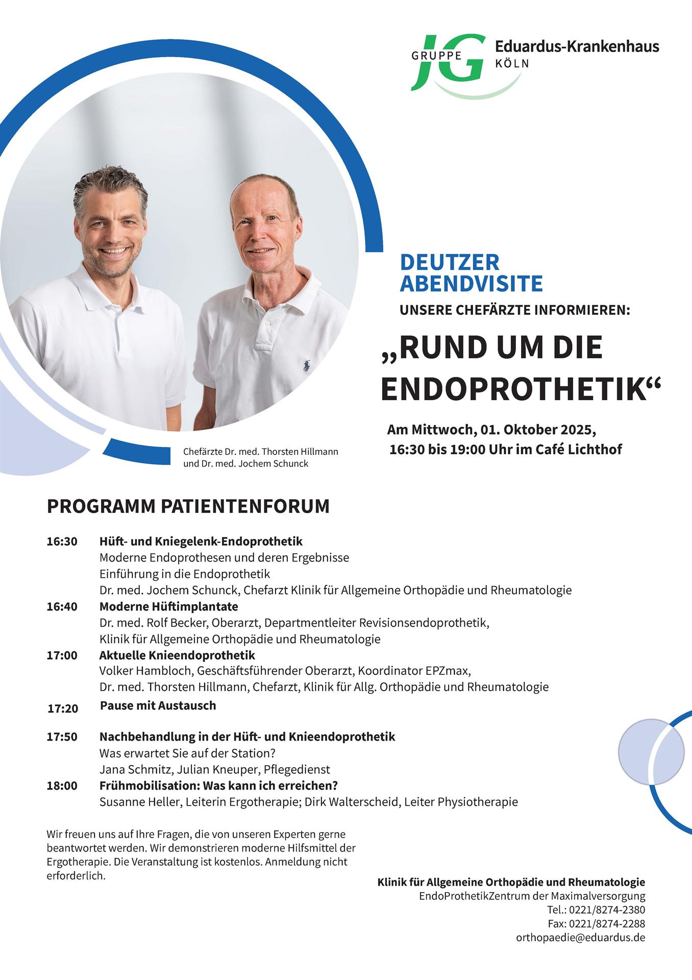 Chefärzte, Oberärzte und weitere Experten informieren über Hüft- und Kniegelenke, Nachbehandlung und Mobilisation und beantworten Fragen der Gäste